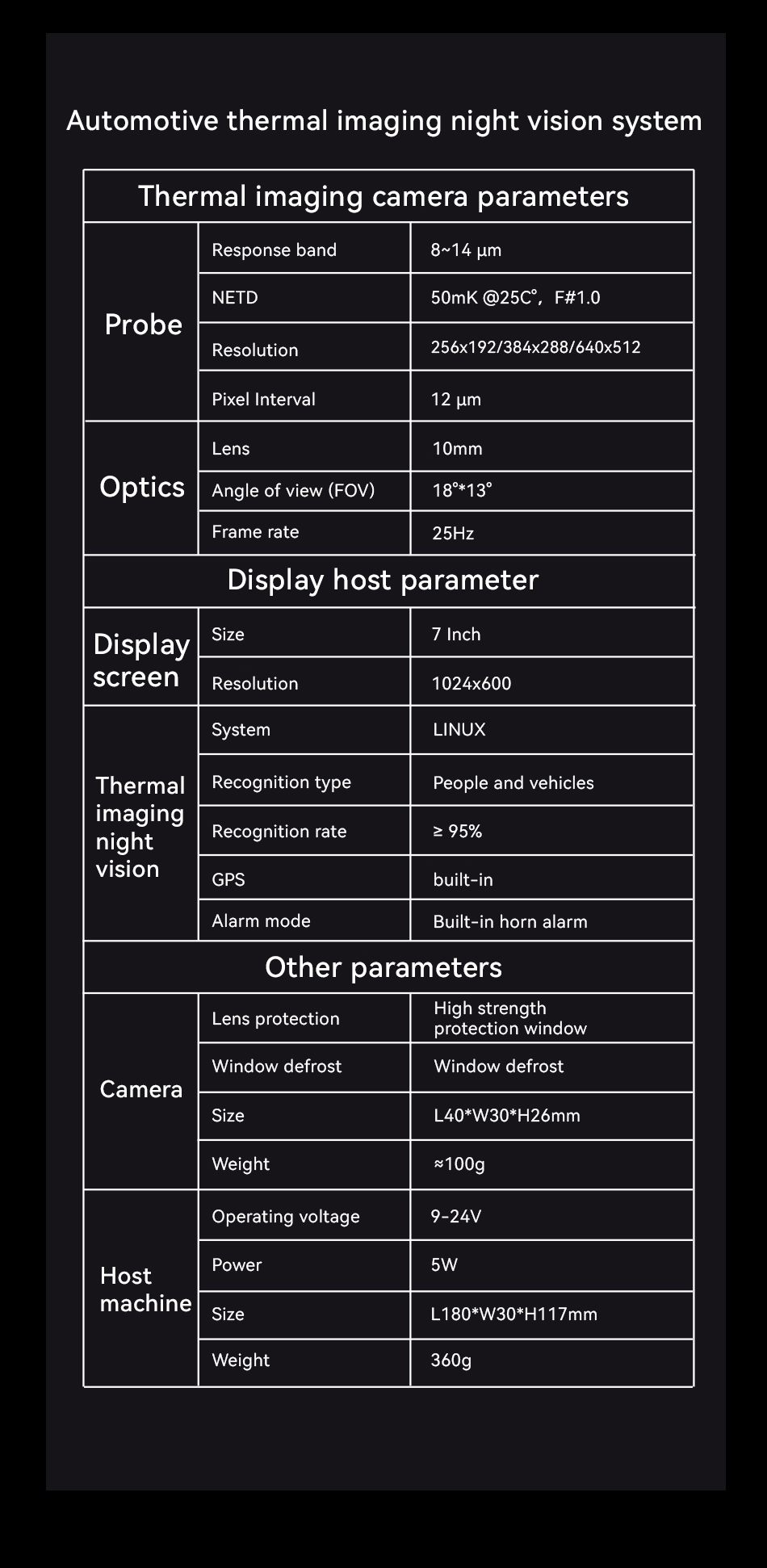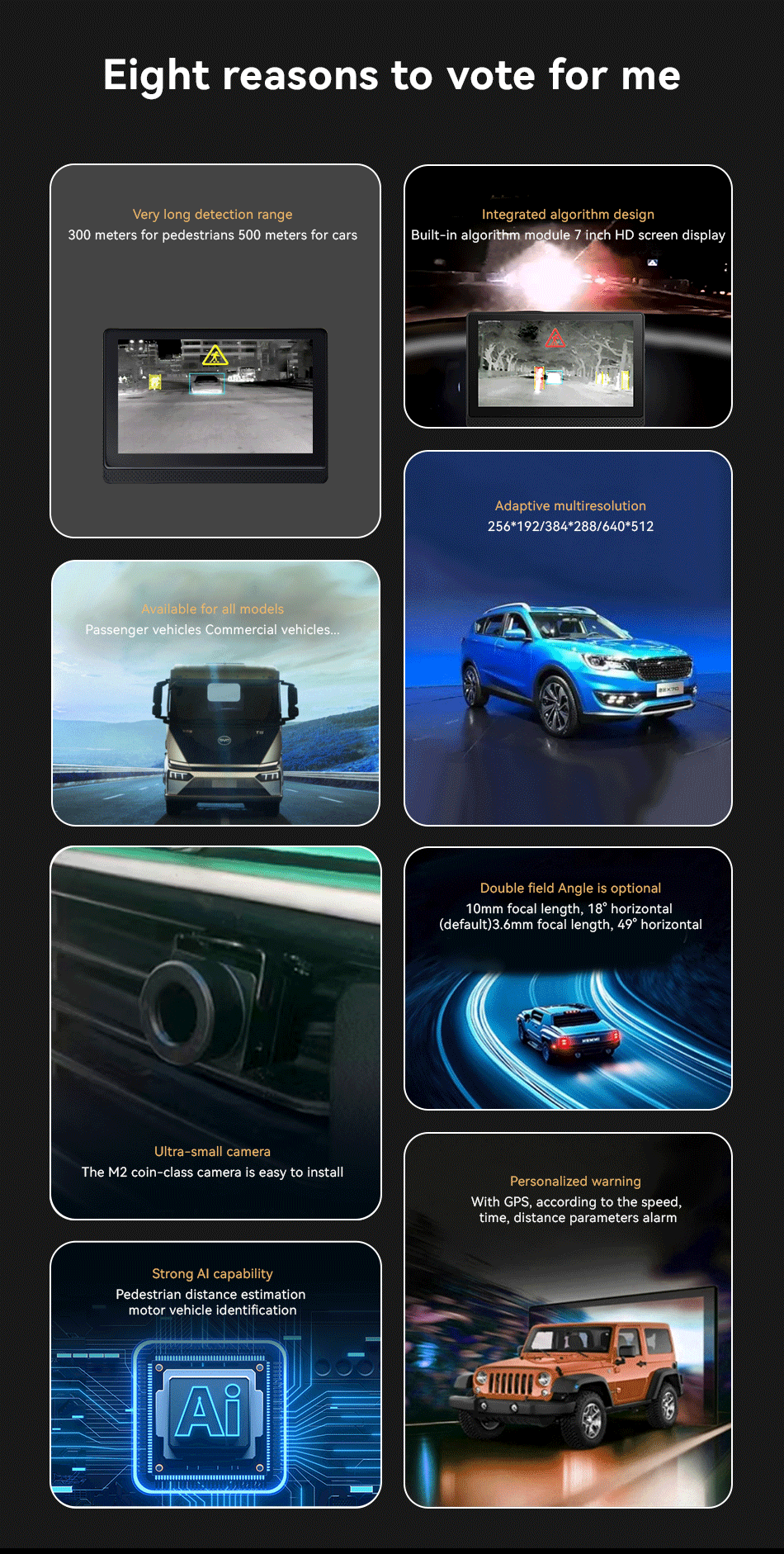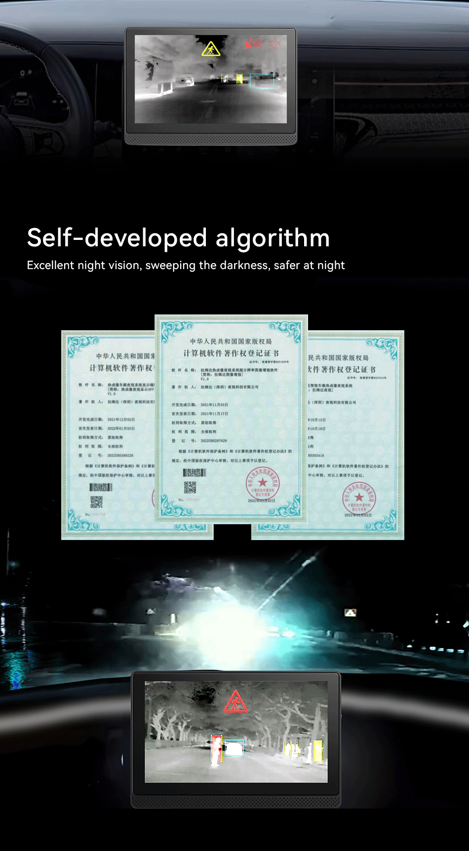 WINBIG automotive thermal imaging night vision system is embedded with optimized computer vision algorithm to recognize pedestrians and vehicles accurately. It also supports warning function to improve driving safety.